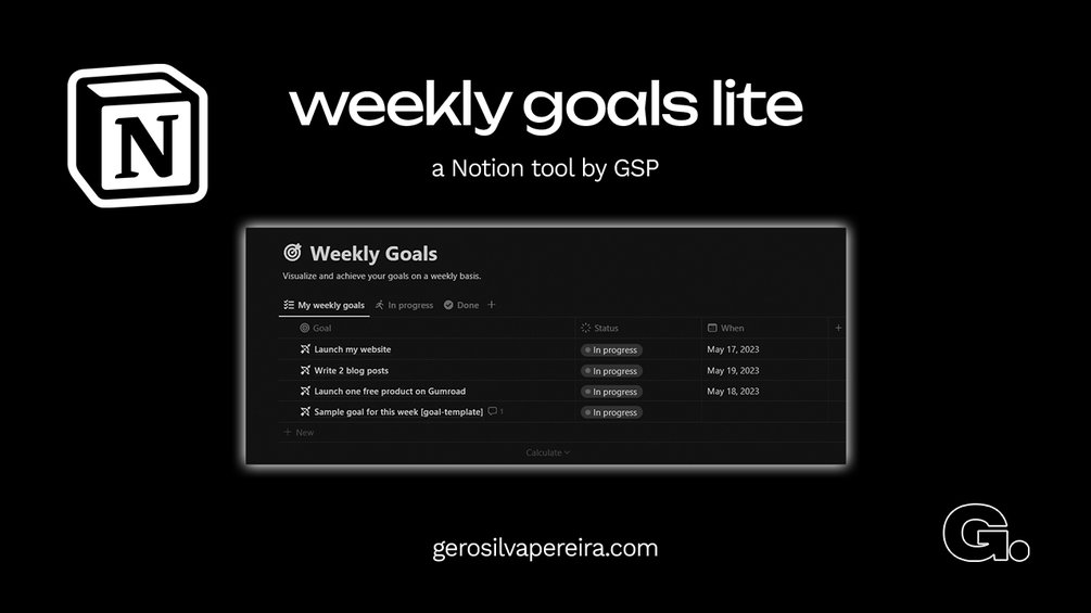 Weekly Goals Lite is a Notion-based tool to help you get things done and make progress. Made by GSP.